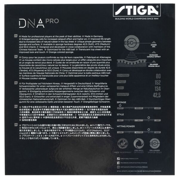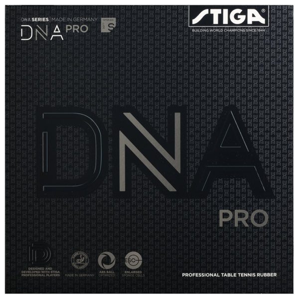 The DNA series is STIGA’s first table tennis rubber manufactured in Germany. These table tennis rubbers are designed for a wide range of table tennis players and playing styles, from young talents who are starting to play with their first customised bat to professional players who only settle for the very best. We have developed and designed DNA Pro in collaboration with Swedish and Chinese national team members to create a rubber that is optimal for the modern, offensive playing style. A table tennis rubber for those who play with great power and enjoy attacking – a high performance rubber that delivers results. ESC (Enlarged Sponge Cells) technology means that the sponge has larger pores that provide a catapult effect, and thereby a higher arc in topspin rallies. It also means that the contact between the blade and the rubber is reinforced, thus providing a better feel and a crisp, clear sound when hitting the ball. The soft sponge provides an increased “dwell time” (contact time between ball and rubber) and more control without loss of spin or speed. In addition, the rubber generates the characteristic soft click sound. DNA Pro has a unique pimple geometry developed to suit the aggressive playing style of the new generations, with a focus on power and spin. The rubber is also optimised for the ABS ball, and thanks to the combination of natural and synthetic rubber, it is considerably more durable than previous generations of table tennis rubbers.